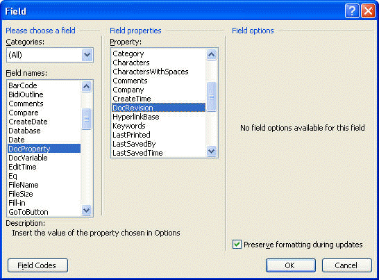 Now you need to replace the existing hard-coded version number in the document with a field code that inserts the current value of the property.