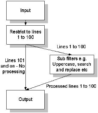 In the example above, a restriction filter passes lines 1 to 100 of the main text to the sub filter, which can be any combination of filters, such as a Convert to Uppercase filter, a Database filter, a Search and Replace filter, or another restriction. The processed text then rejoins the main text. The net effect is that the filter constrains or limits the effect of the sub filters to just lines 1 to 100, all other lines are unaffected.