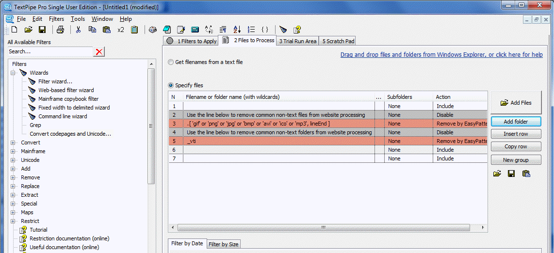 Drag and drop anywhere in TextPipe's window - they appear on the Files to Process Grid: