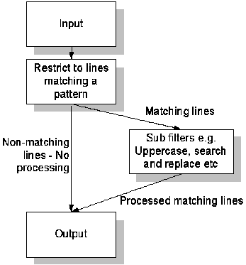 In the example above, a filter restricts lines from the main text to those matching a pattern. These matching lines get passed to the sub filter, which can be any combination of filters, a VBScript filter, a Search and Replace filter, an Output to File filter etc. The processed text then rejoins the main text. The net effect here is that the restriction filter limits the effect of the sub filters to just lines matching a pattern, all other lines are unaffected.