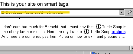 Let's say that you have the word "turtle" on your website. If Microsoft, or one of their advertisers wants to attract visitors related to that word, they can use smart tag technology to put a click-able icon next to every instance of that word. These "instances" can be within one of several apps on your machine - including Internet Explorer.